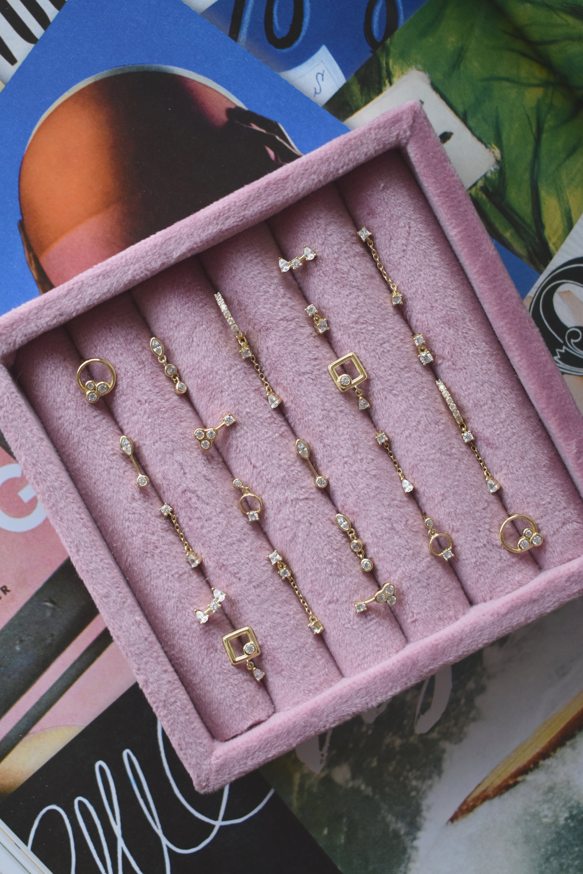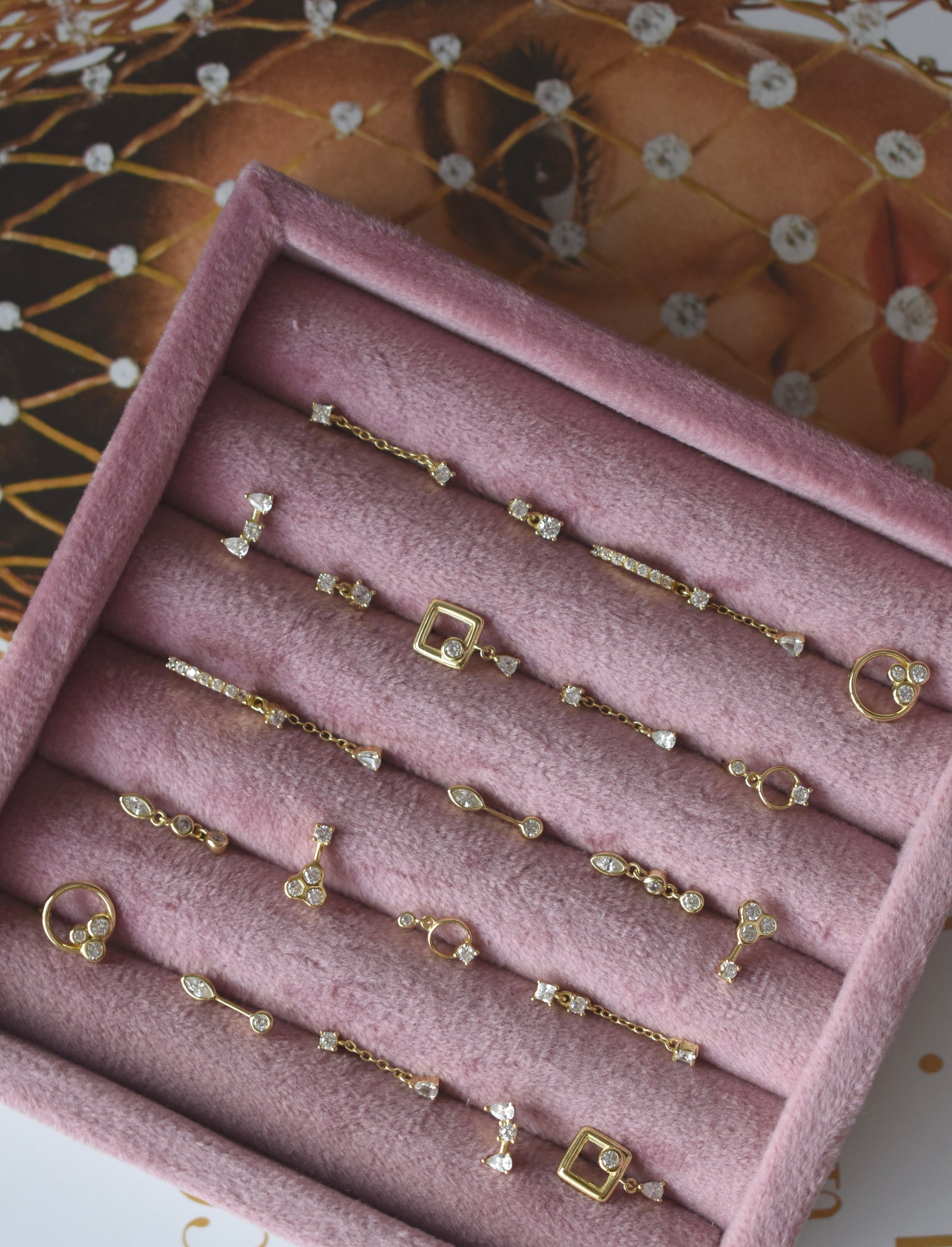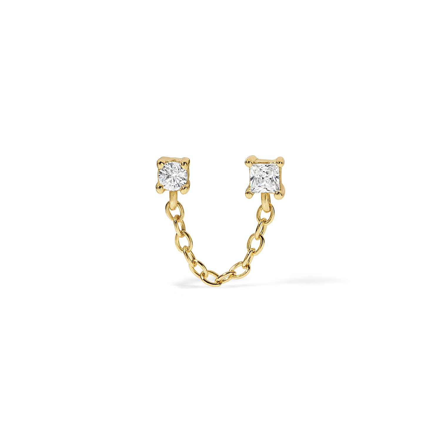Designed for a double piercing, Knot features two studs linked by a delicate gold chain.