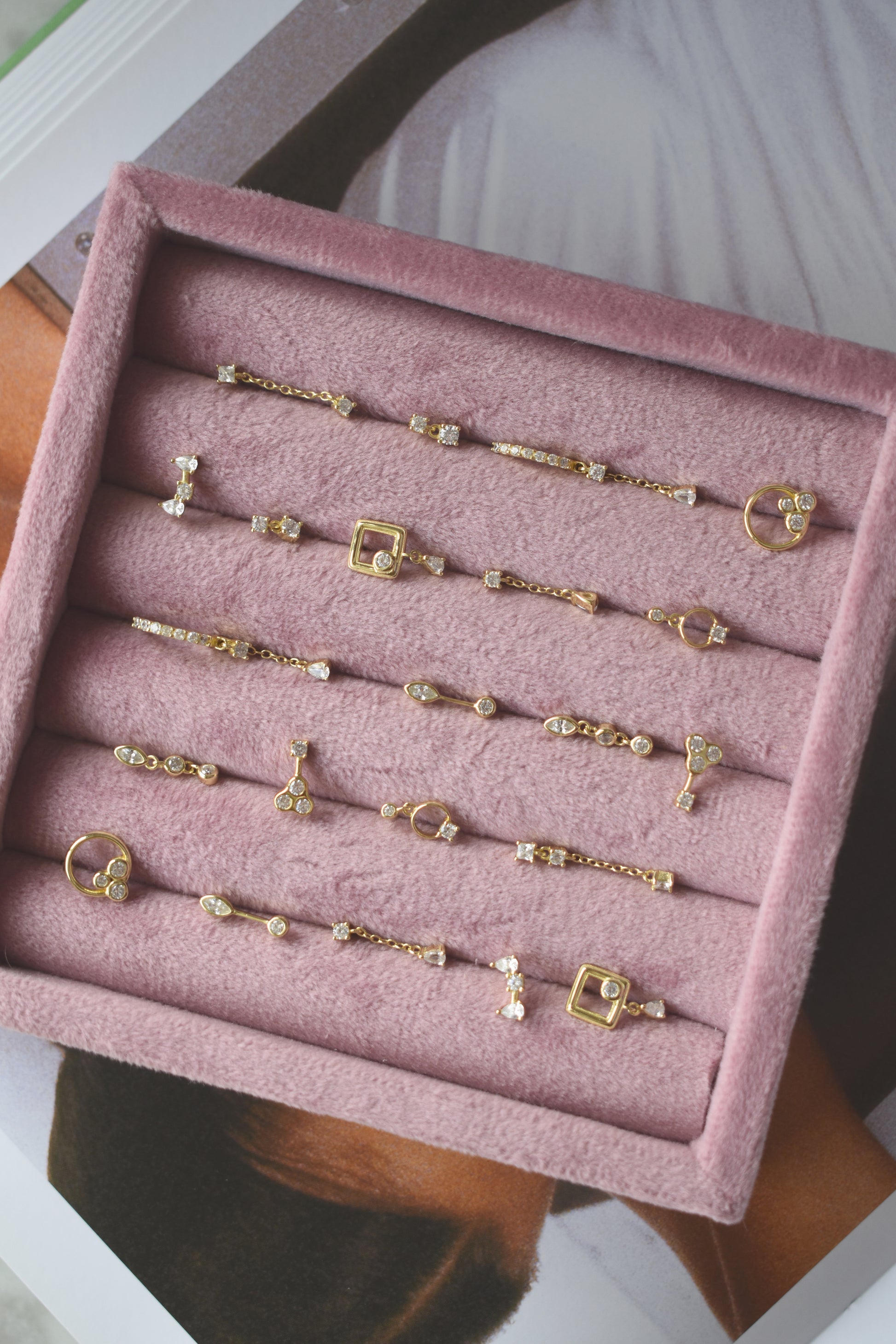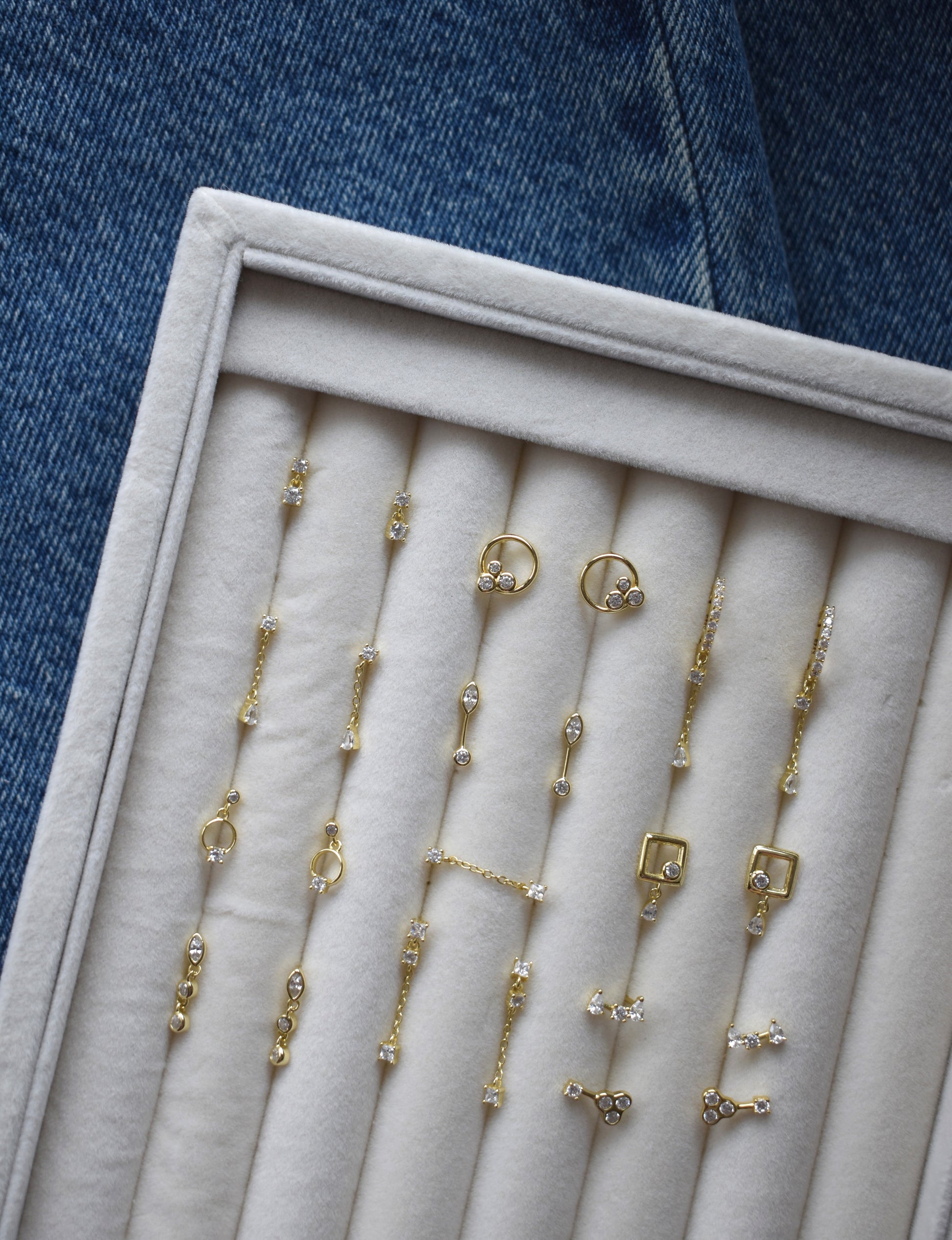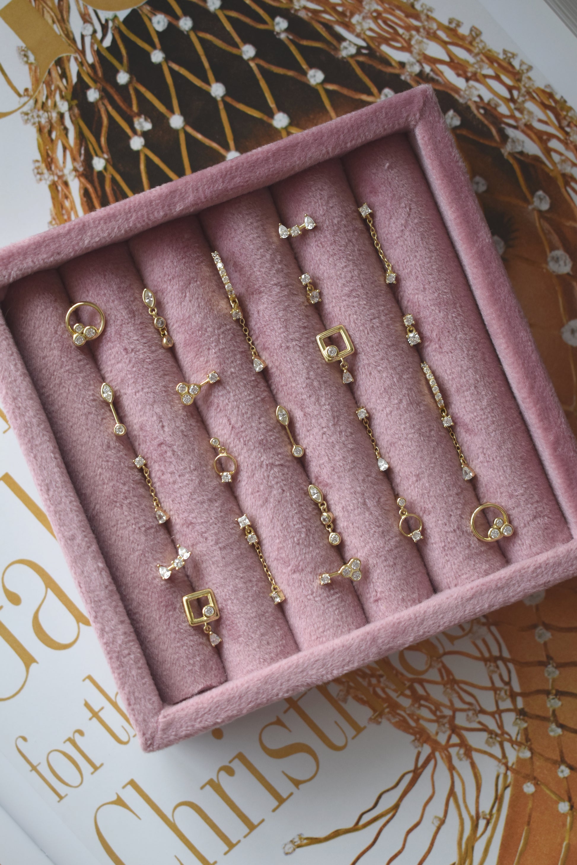 Designed for a double piercing, Knot features two studs linked by a delicate gold chain.